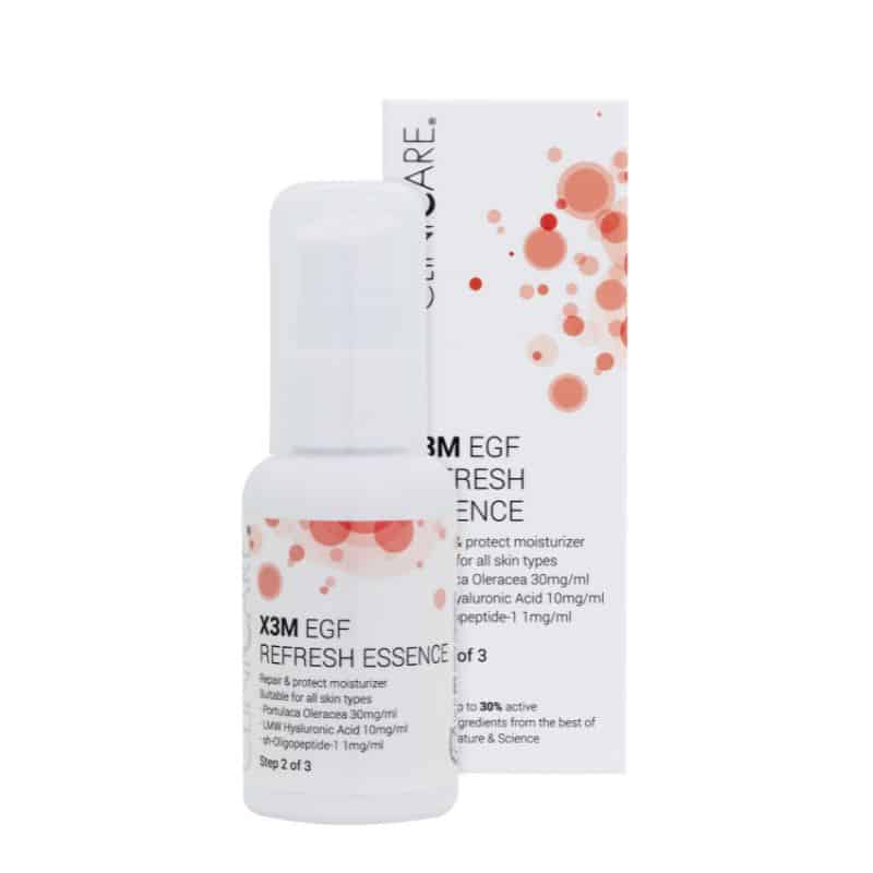 Rauhoittava, kosteuttava ja ihon vastustuskykyä vahvistava tehotiiviste. Sisältää biohyaluronihappoa ja portulakkauutetta. Cliniccare X3M EGF REFRESH essence muodostaa iholle suojaavan kerroksen, korjaa vahingoittuneita kudoksia ja tekee ihosta kuulaan. Suositellaan käytettäväksi Serum -emulsion alla iltaisin, Sun Block Silky Cream -aurinkosuojan kanssa päivisin tai sellaisenaan meikin alla.
