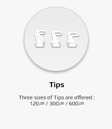 • Pistesäteet: 100 µm, 300 µm, 600 µm (vaihtoehtoiset)