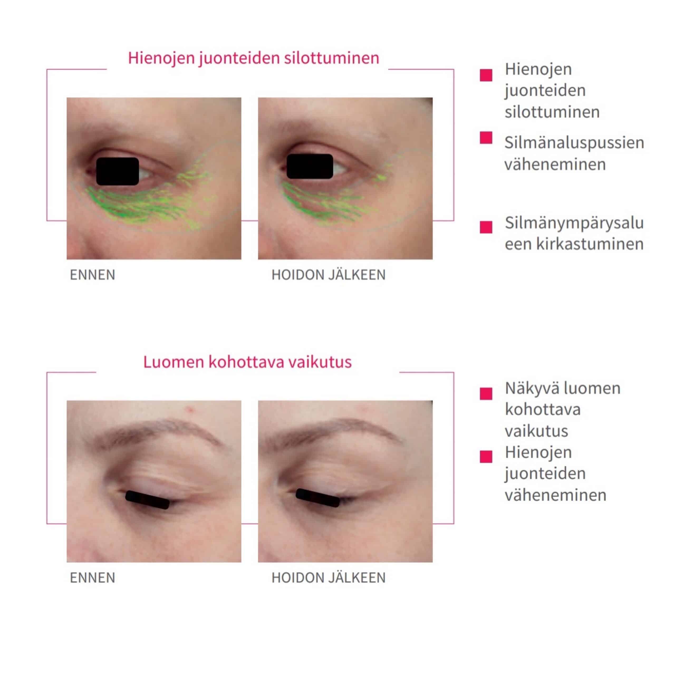 4. Aseta EYE+ nanomaski alueelle ja anna vaikuttaa 10-15 minuuttia voit hieroa lopun tuotteen kasvoille.